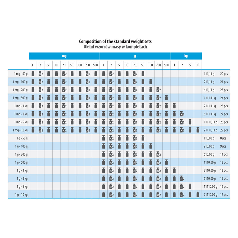 - Massima precisione - la deviazione ammessa dal peso effettivo è minima, rendendo questa classe di standard ideale per le applicazioni in cui ogni grammo è importante.